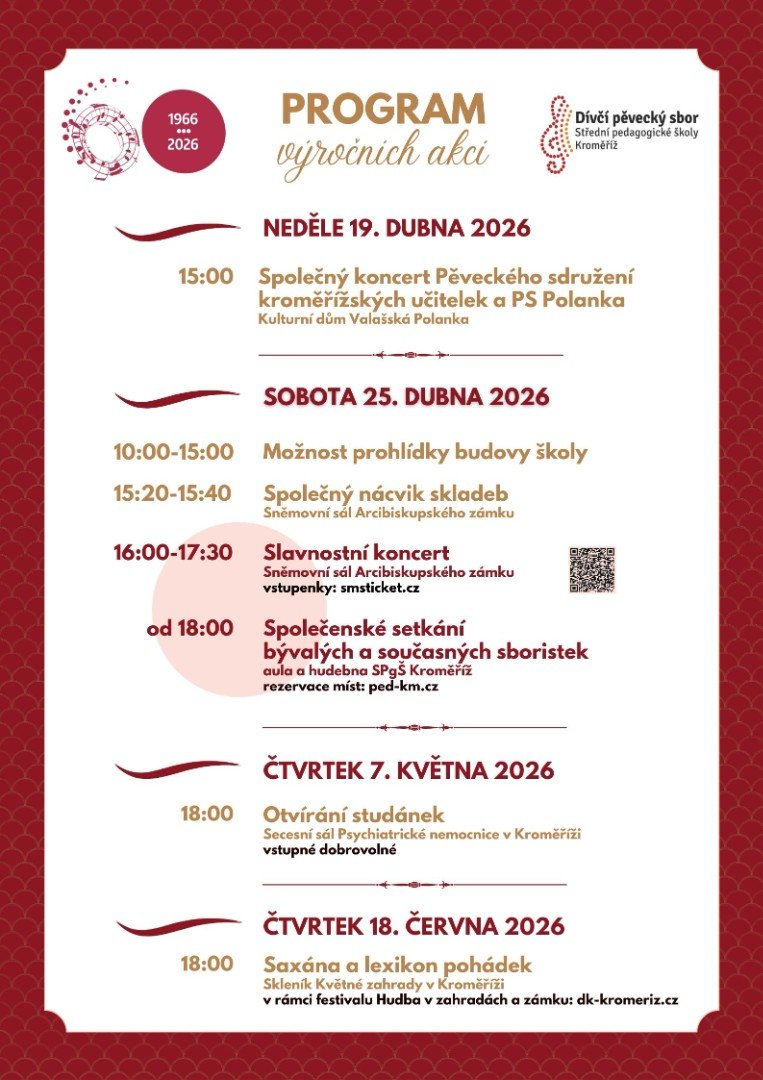 V průběhu celého roku 2026 si bude Dívčí pěvecký sbor připomínat letošní jubileum 60. výročí založení sboru. Hlavní termín oslav je naplánován na sobotu 25. dubna 2026, po koncertě ve Sněmovním sále Arcibiskupského zámku v Kroměříži bude v prostorách školy následovat přátelské setkání bývalých členek sboru, spolupracovníků a hostů. Oslavy se konají za podpory města Kroměříže a Zlínského kraje.